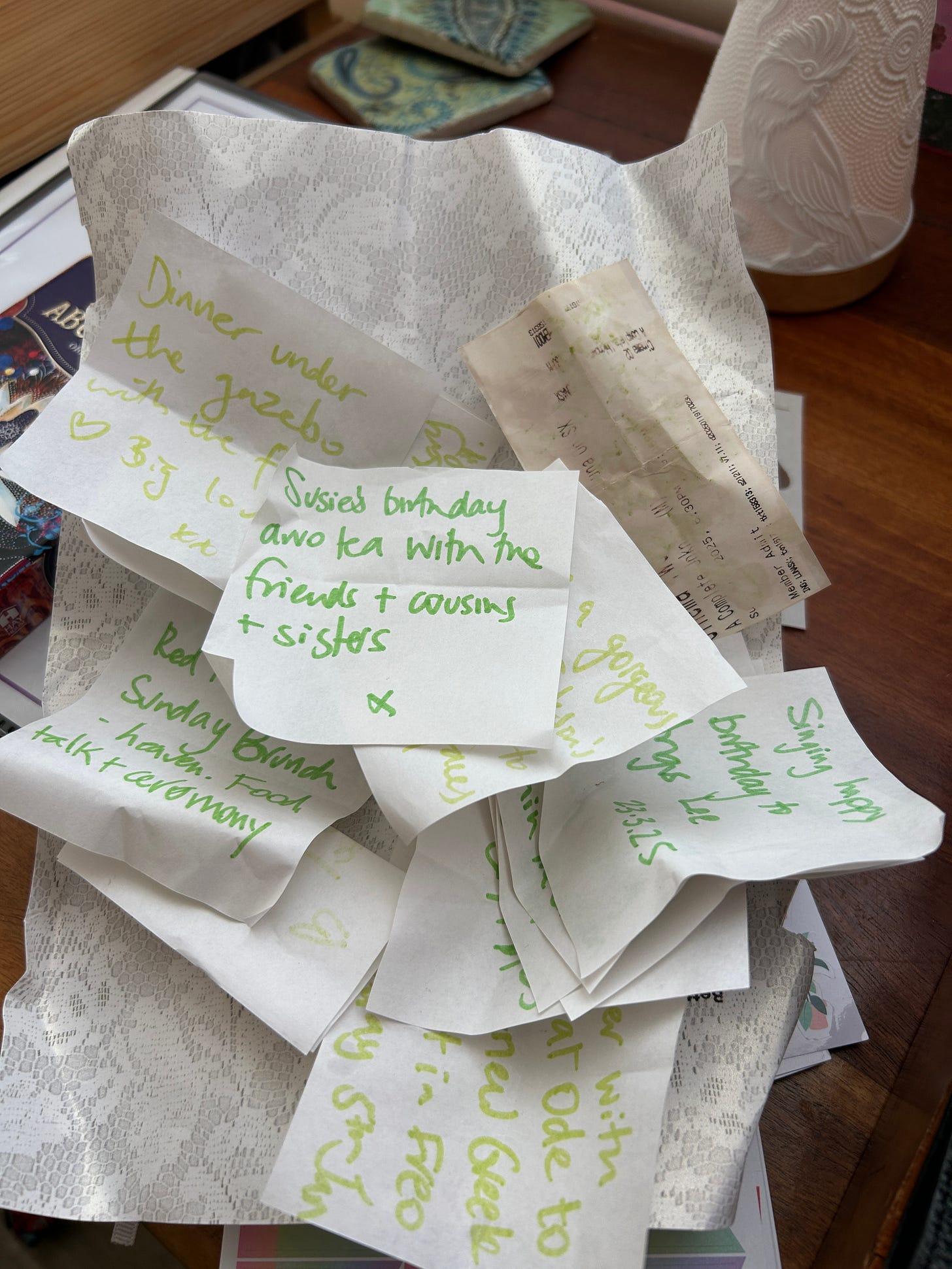 So there is one little ache as I finish up my 2025 navel gazing. I tried to set up a weekly jar of good moments. But something about this felt tender and vulnerable and perhaps a bit stoopid. Mostly my beloveds were not inclined to commit happy moments to the little square bits of paper I left next to the memory jar. I tried encouragement and maybe a little coercing in the first few months of the year but I gave up. So only a handful of weekly memories have been committed to paper, folded and put into the jug I left on the hearth. Looking through the few of them still gives me a warm, glowy feeling. Should I try it again in 2026?