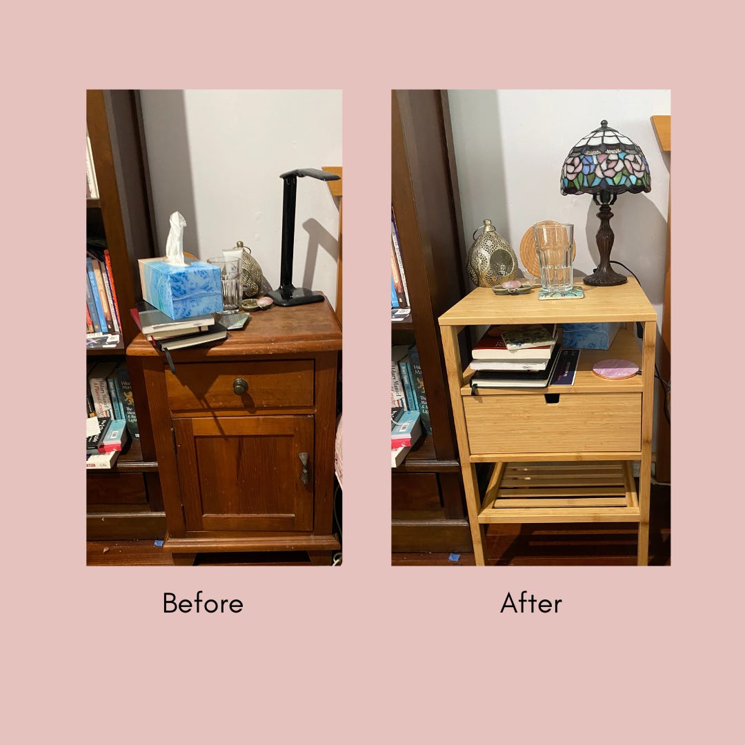 This intrepid Saturday venture was all in search of a new bedside table that allows for me to have an extra shelf for my books and journals. Before and after shots below. See how I have SO much more room on the top? And ok, I cheated, there is the new lamp as well which I have been wanting for ages.