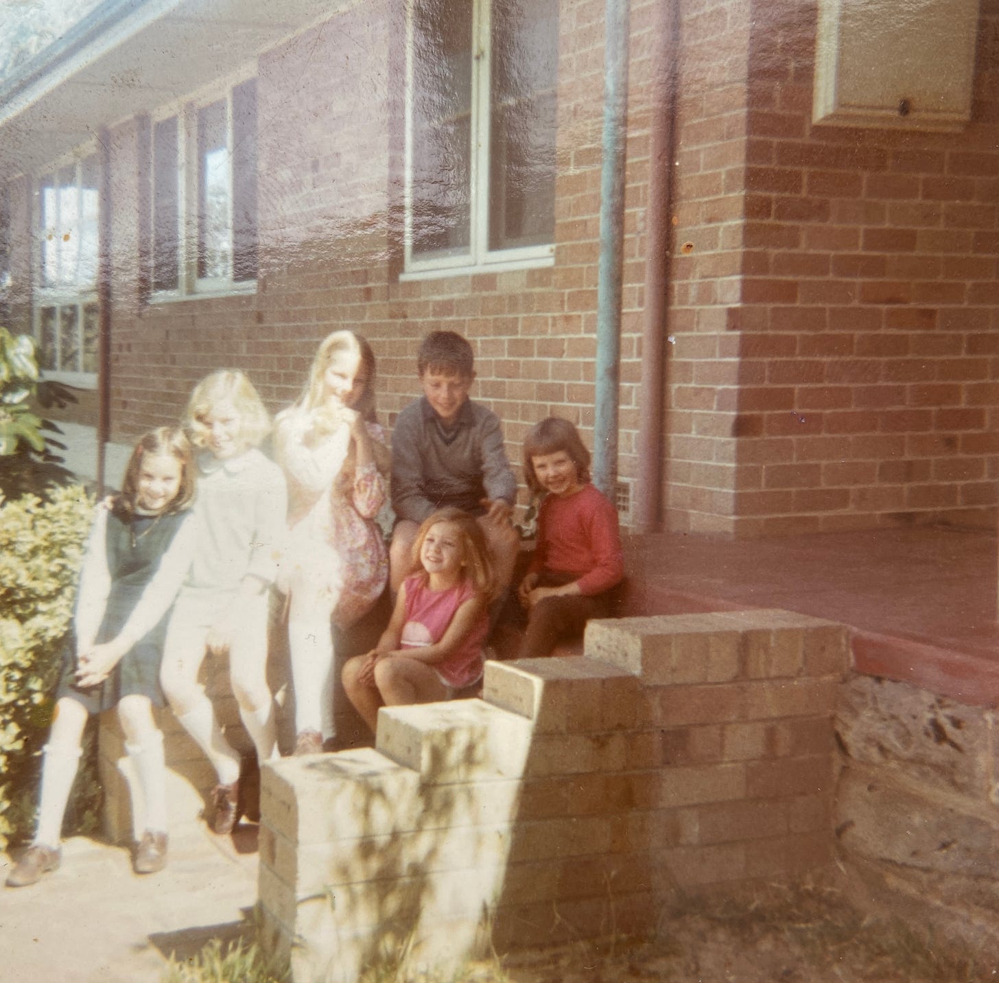 Mum has us the six of us children posed on the five steps leading from our front door to the terraced lawn. We had to find a spot to perch for the image. As a four-year-old I took up the least space, and yet I’m leaning back, my blond bob skimming my shoulders. I got the centre focus of this shot at least, my eldest sister, the birthday girl is half in sun, half in shade, beloved cat in arms. Ages 12, 10, 9, 8, 6, 4. All the gang like a countdown.