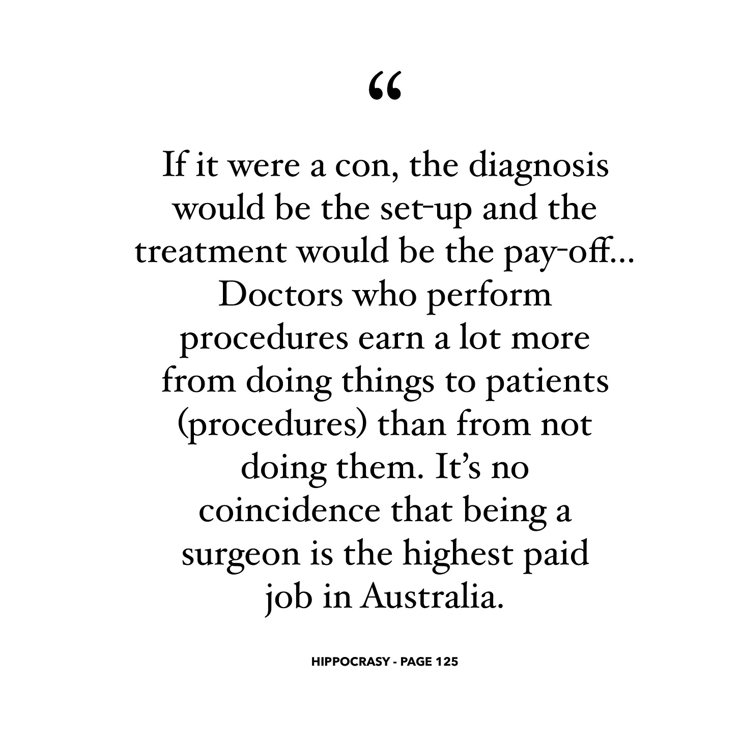 The last word belongs to the two doctors who wrote Hippocrasy—How Doctors Are Betraying Their Oath. One author, Ian Harris, appeared on the spinal surgery Four Corners episode.