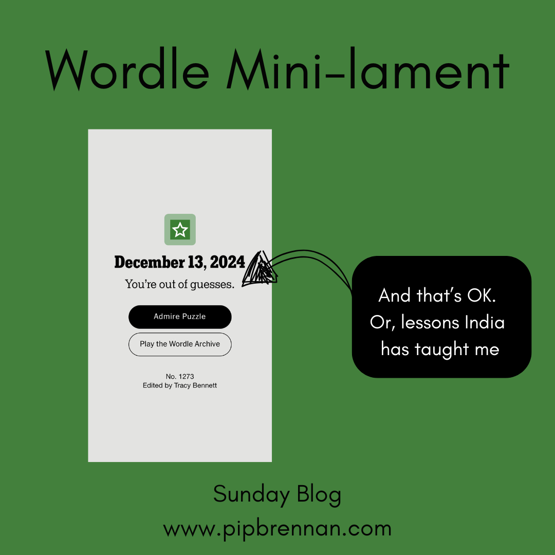 Up until this week I could’ve told you how many days ago I landed in India. 50. That was the day I missed Wordle by losing five hours and several layers of my stomach lining through the stress of actually flying there there. (You may recall the muffed visa, missed flight, nice man at Delhi airport putting me in a wheelchair and rushing me to my closing flight).