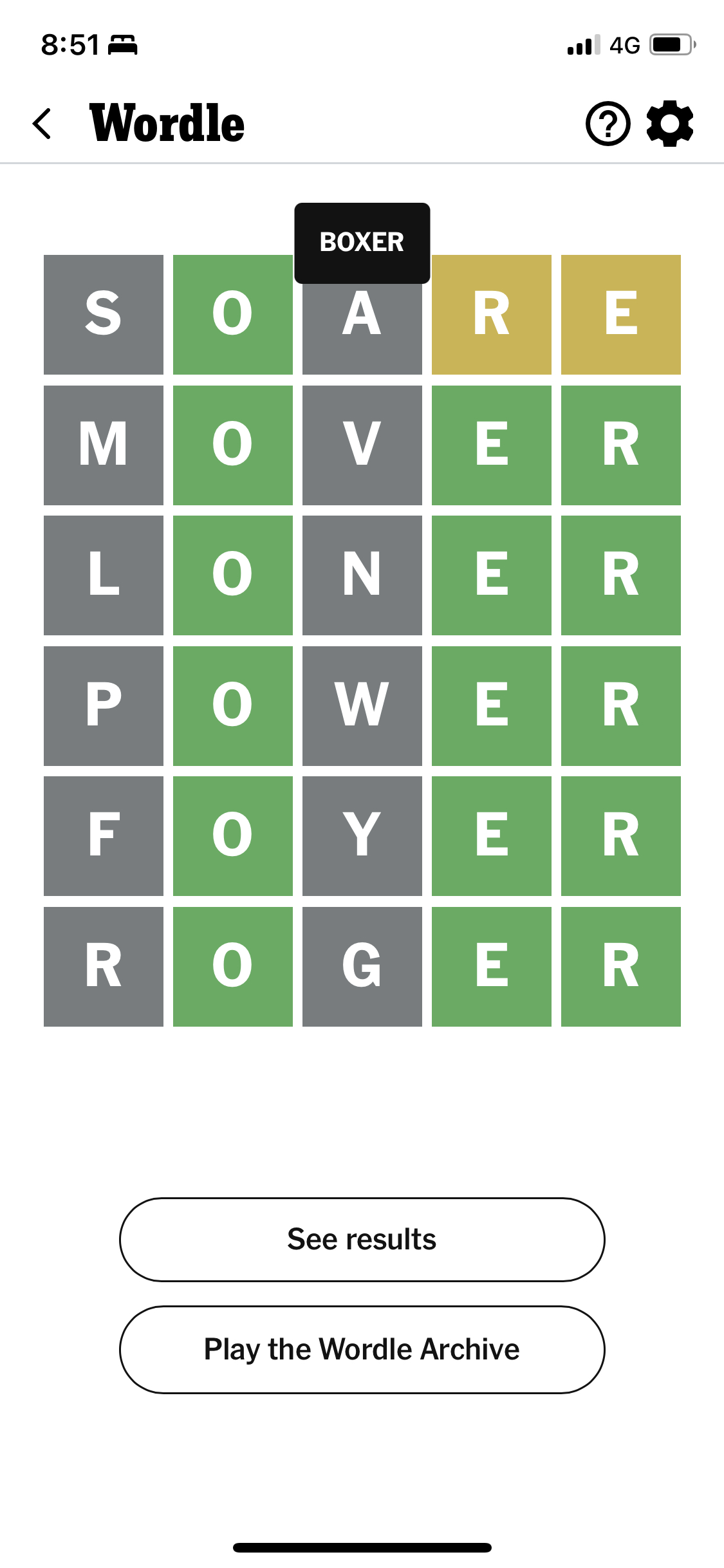 This week, I busted again. One of those easy words with way too many options broke my streak of 50. But it was a light and easy loss.